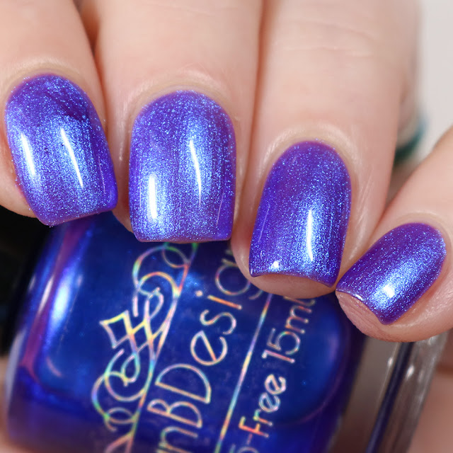 Inspired by the Blue Ringed Octopus. Described as a deep purple jelly base with intense blue to purple shifting shimmer. Shown here in 3 coats, plus top coat. Formula was sheer but builds up well. Dries smoothly with no texture however a top coat is still recommended for a full, glossy finish.